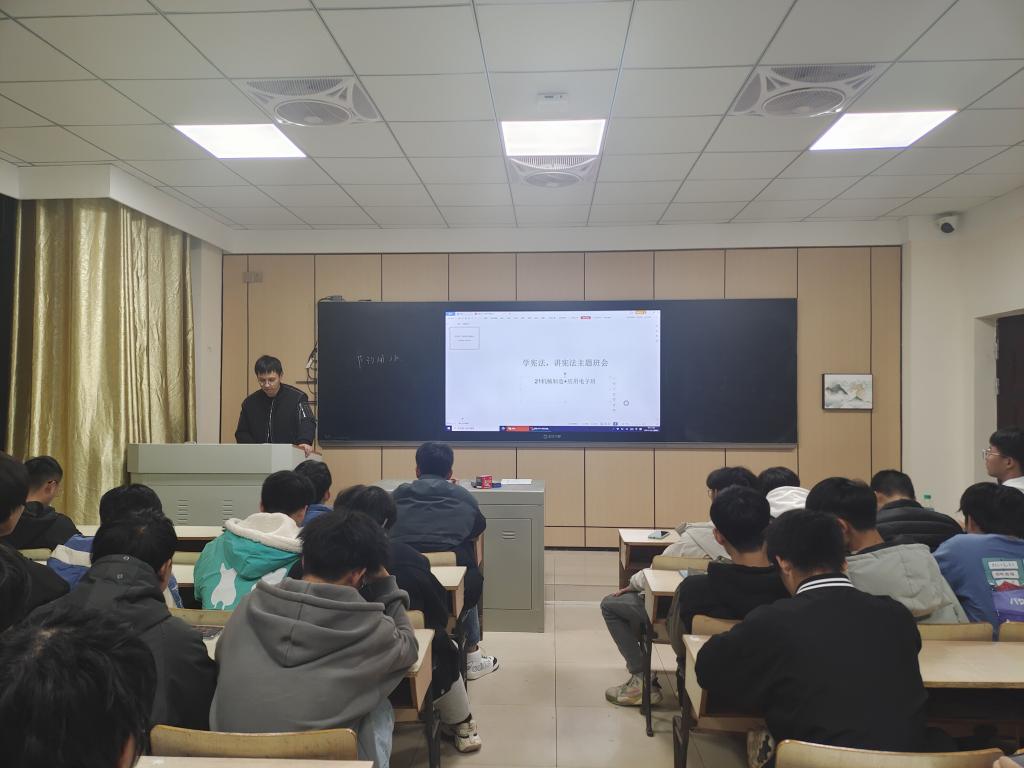 召开“学宪法 讲宪法”主题班会。我院保卫处携手学工处积极组织各系召开“学宪法 讲宪法”主题班会,各系辅导员通过播放宪法产生和发展的历史背景的视频,以幽默风趣的宣讲,向在座的同学们提问宪法小知识,使同学们加深了对宪法知识的了解,增强同学们的宪法意识。