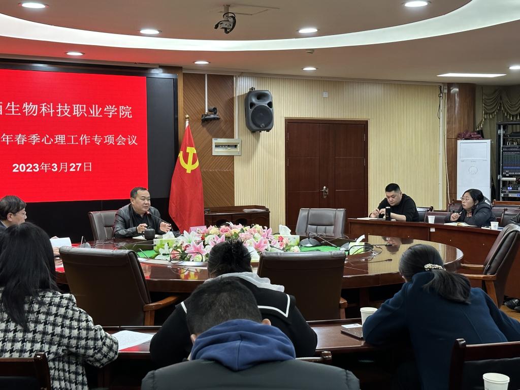 3月27日下午,我院2023年春季心理工作专项会议在知行楼3楼中层干部会议室举行,学院党委委员、副院长王义林出席会议,心理健康咨询中心主任、副主任、各系部主任、书记、副书记、学管干事、生物科技园负责同志及中心全体工作人员参加了本次会议,会议由心理健康咨询中心主任主持。